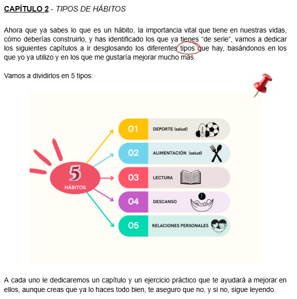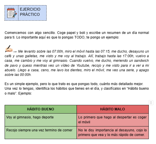 - Ejercicios prácticos al final de cada capítulo para poner en marcha los cambios desde el primer día. Se trata de que te enseñe algo y lo pongas en práctica de verdad, no de que lo leas y lo olvides.