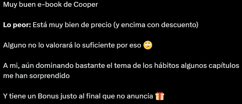 - Lenguaje claro y cercano. Te hablo como lo que soy, uno más, como tú. Trato de cambiarte la vida y lo que haces en tu día a día, pero sin fórmulas mágicas e imposibles. No se trata de conseguir millones y perder la vida en el intento, se trata de tener una vida mejor, trabajar lo justo y priorizar lo que nos llena.